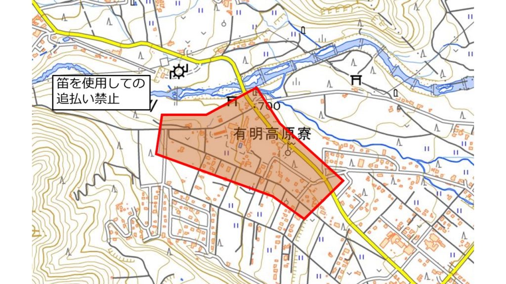 有明高原寮付近での笛の使用について 未分類 2025.01.22 有明高原寮より、公務で使用する笛の音との混同を避けるため、付近での笛の使用を止めていただくよう要望がありました。 隊員の皆様は有明高原寮及び周辺道路上(下図参照)では、笛や笛のような音を鳴らさないように追い払いをお願いします。